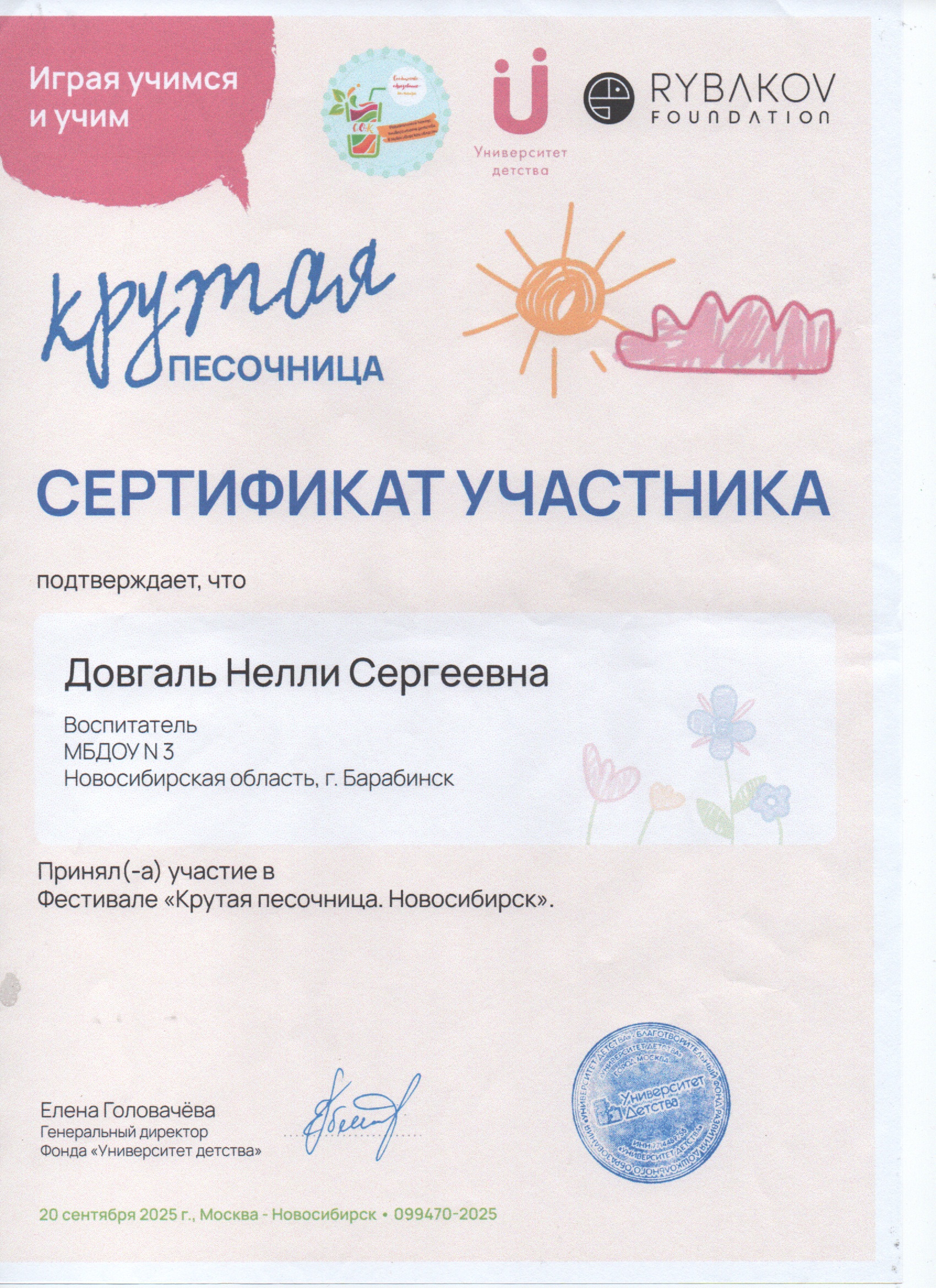 Сертификат участника "Крутая песочница" г. Новосибирск, 20.09.2025г.