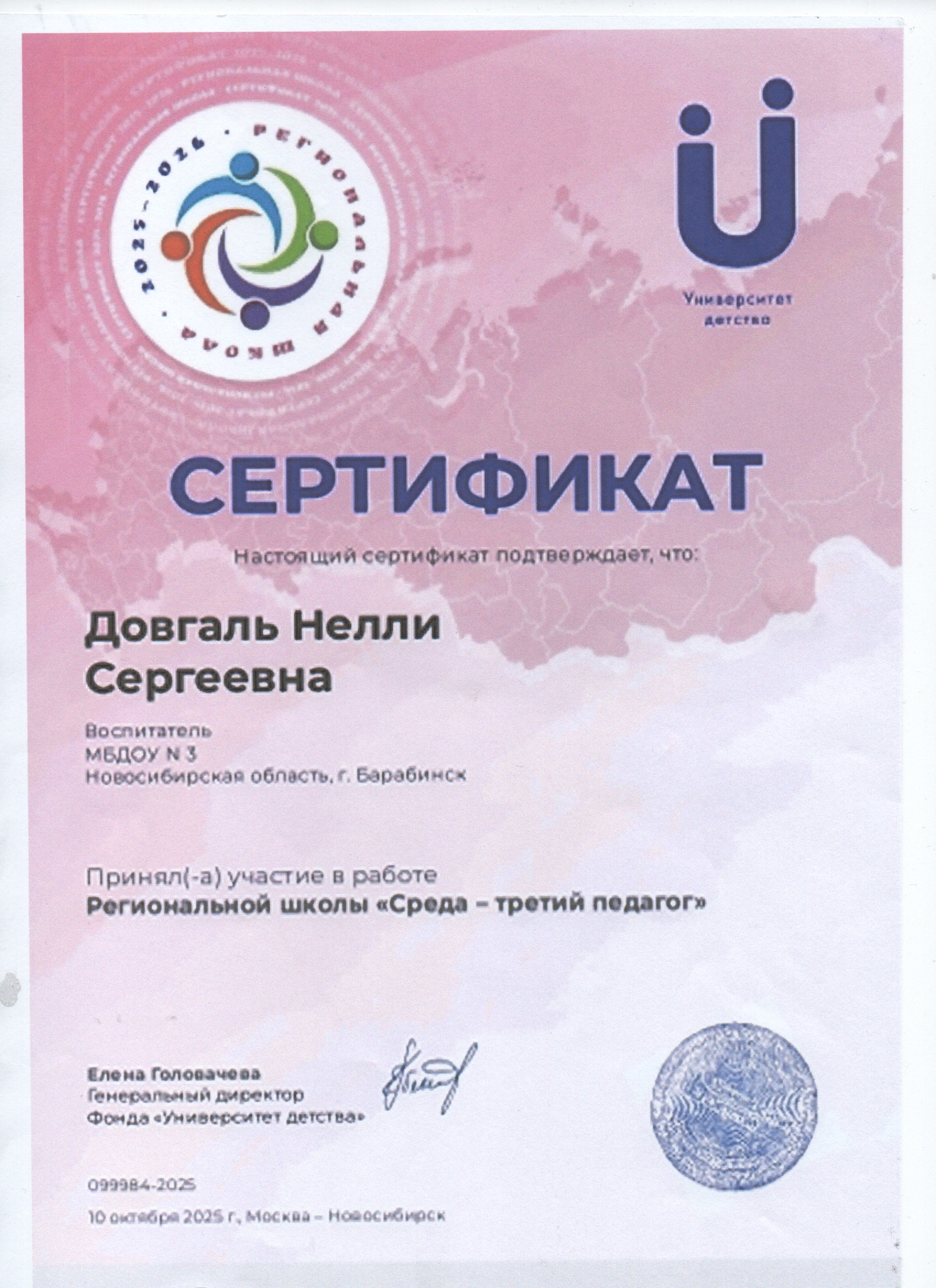 Сертификат участника Региональная школа "Среда - третий педагог". 10.10.2025г., г. Новосибирск