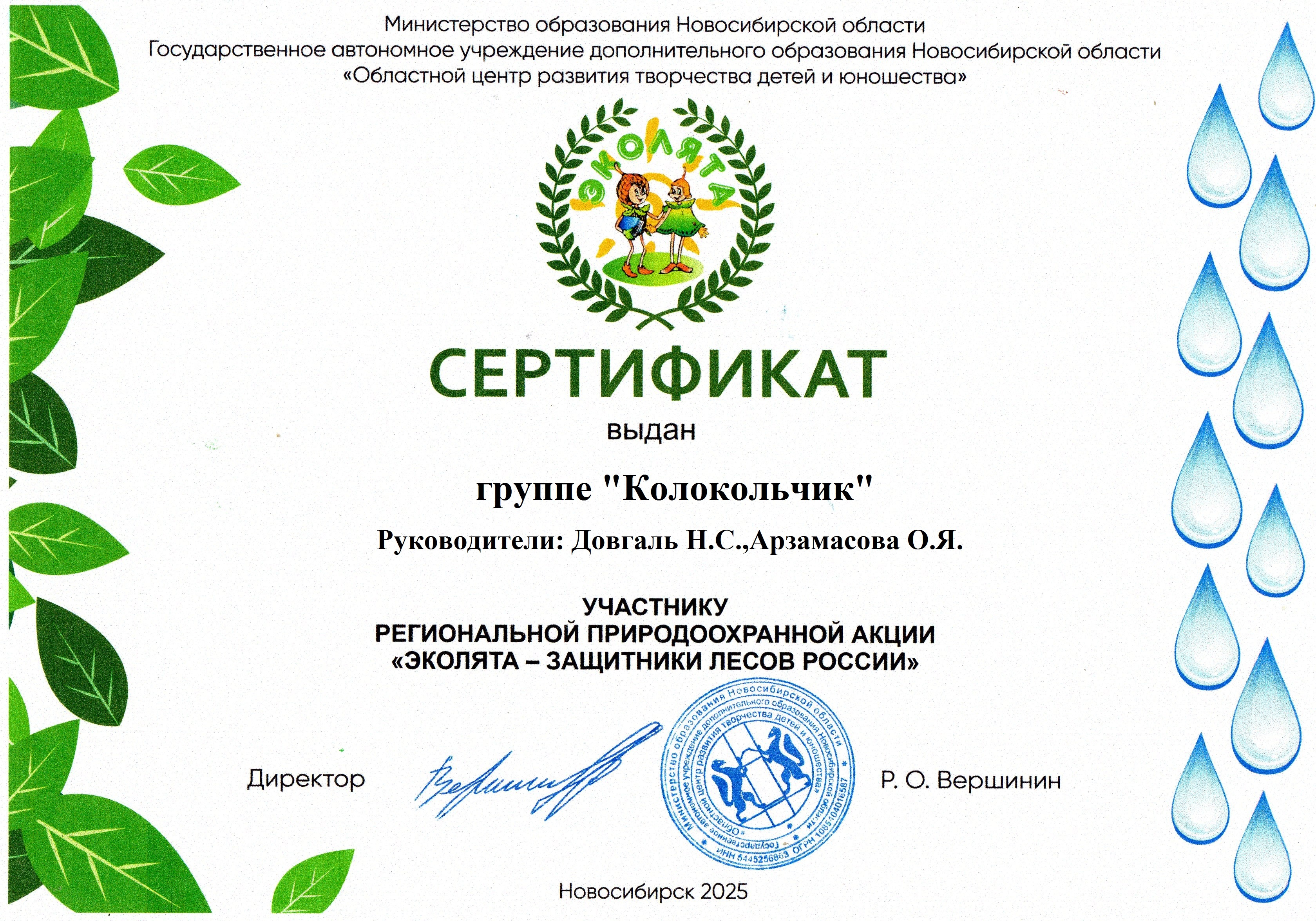 Сертификат Министерства образования Новосибирской области ГАУДО "Областной центр развития творчества детей и юношества" за участие в региональной природоохранной акции "Эколята - защитники лесов России". 2025г.