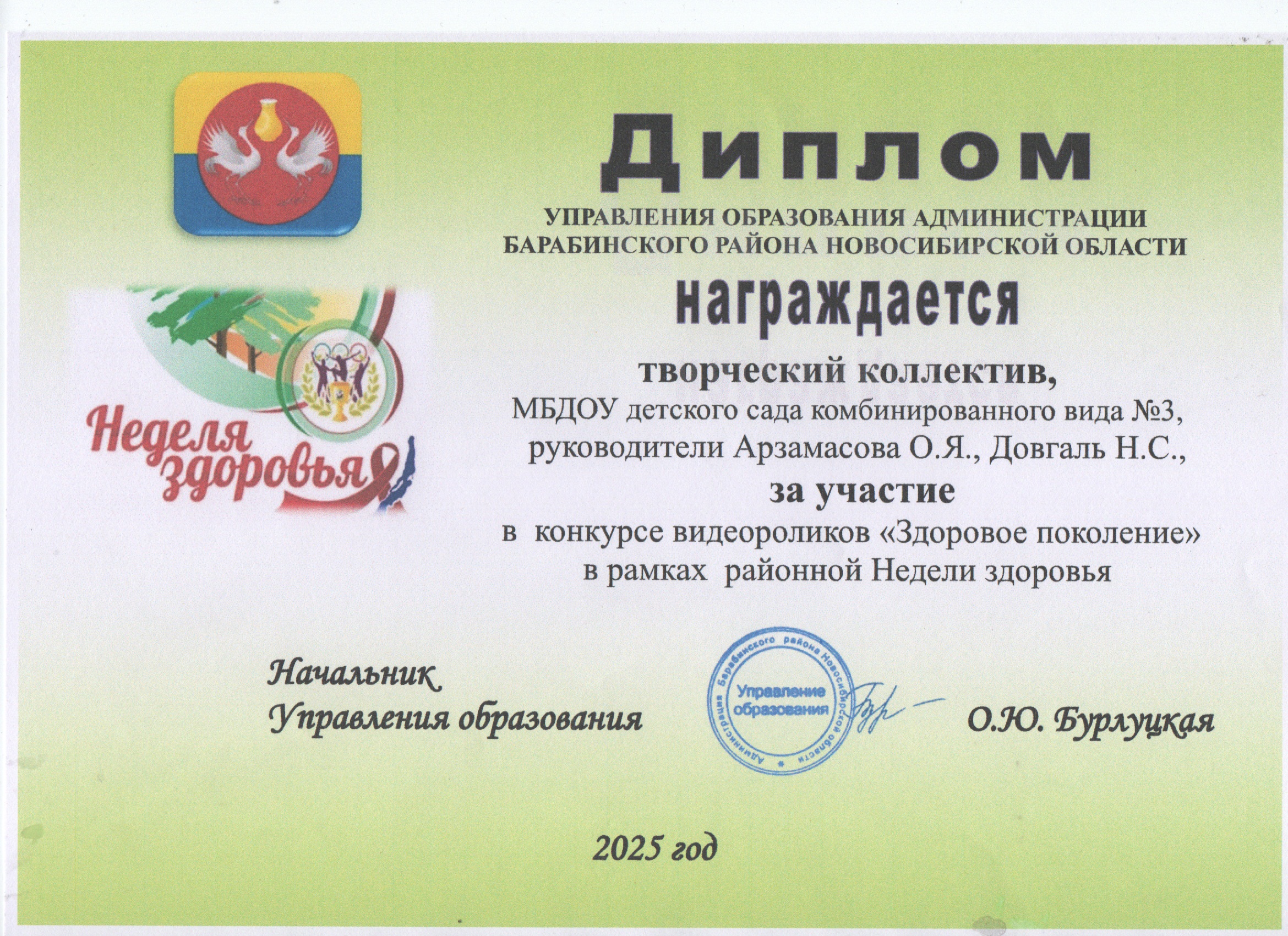Диплом Управления образования Барабинского района Новосибирской области за участие в конкурсе видеороликов "Здоровое поколение" в рамках районной "Недели Здоровья". 2025г.