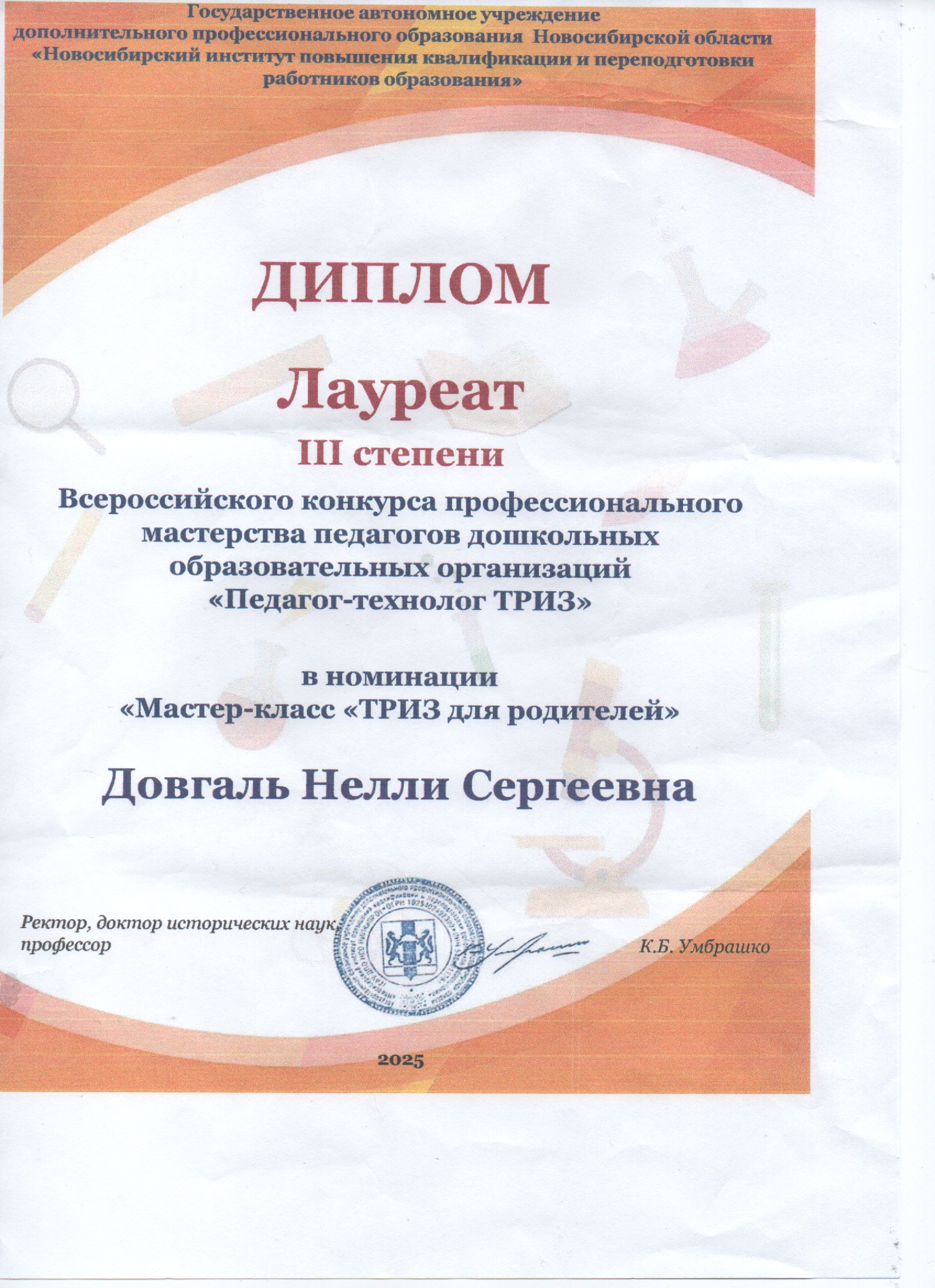 Диплом Лауреат III степени Всероссийского конкурса профессионального мастерства педагогов дошкольных образовательных организаций "Педагог - технолог ТРИЗ" в номинации "Мастер-класс "ТРИЗ для родителей", 2025г.